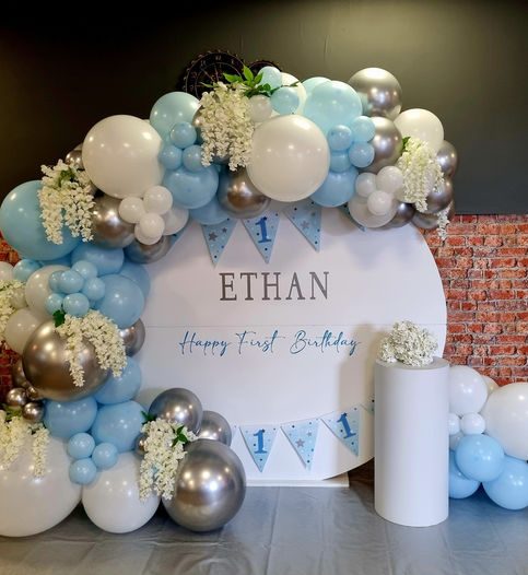 Looking to decorate your birthday party with a personalised balloon backdrop? Check out this custom backdrop with a balloon garland that can perfectly complement cake plinths.
